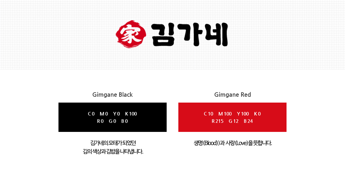 블랙 색상은 ㈜김가네의 모태가 되었던 김의 색상과 김밥을 나타내며, 레드 색상은 생명(Blood)과 사랑(Love)을 뜻합니다.
